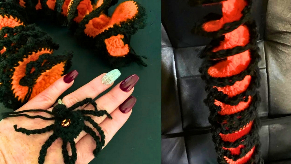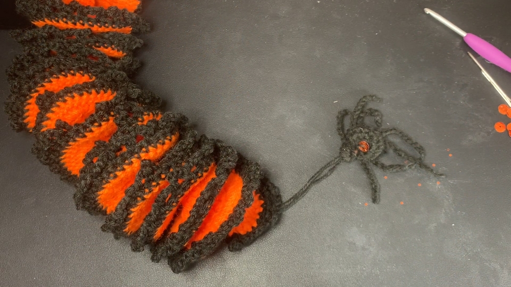 The orange and black yarn, combined with the spider embellishment, make this project perfect for Halloween. The inclusion of a sequined spider creates a glimmering effect under sunlight. - Customizable Length: