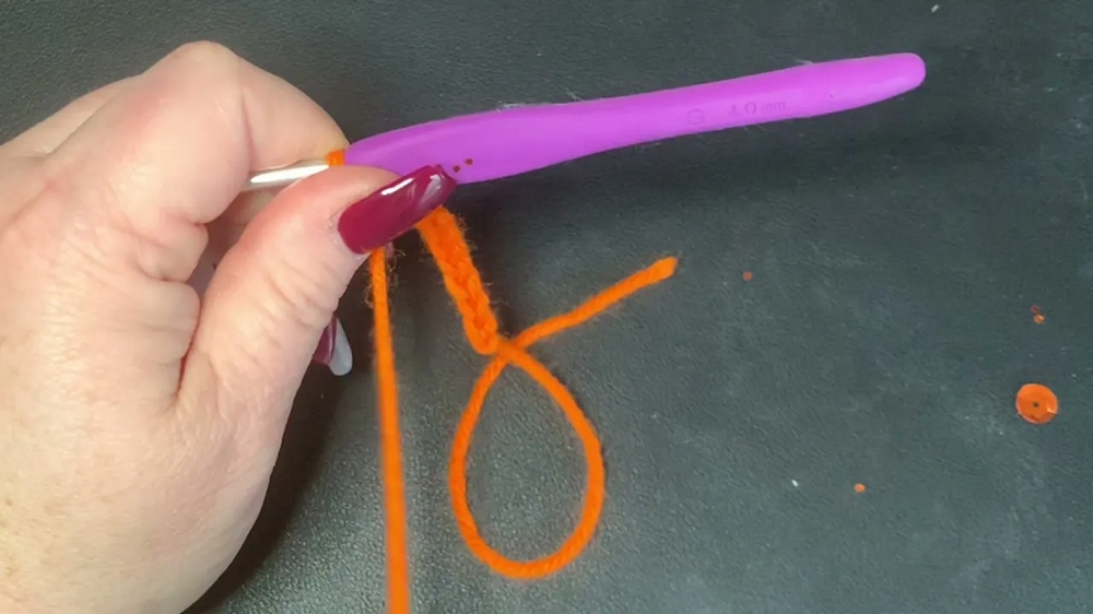 - Attach orange yarn to one end of the chain.