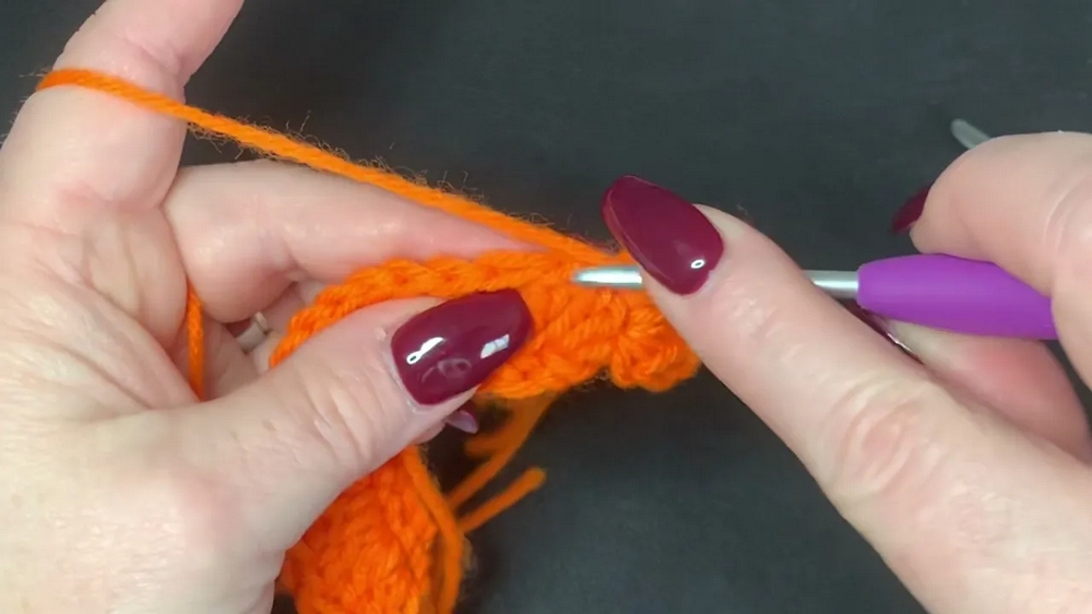 - Reattach orange yarn to one end and begin by chaining 1.