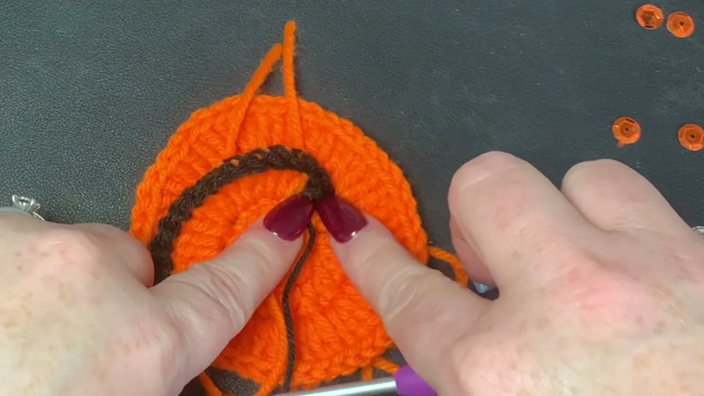 - Attach black yarn to the edge of the spiral.