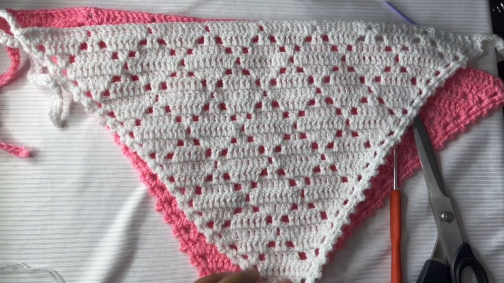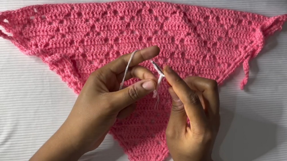 The alternating increases and decreases create a lattice-like texture that feels light yet structured, giving the bandana its signature airy look. By the 24th and final row, the full lace pattern comes to life, showcasing the geometric beauty of the design.