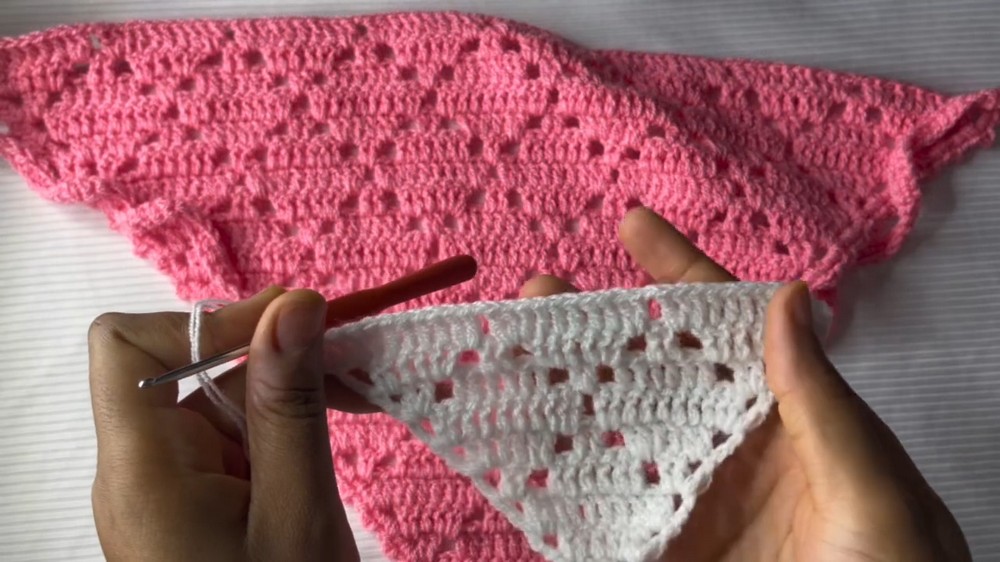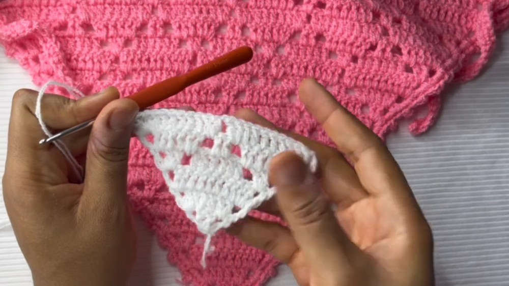 As the project progresses, the mid-point of the pattern introduces an engaging interplay of growth and reduction in the diamond shapes. By consistently chaining four at the start of each row, followed by carefully placed double crochets, the lacework begins to shift and expand dynamically.