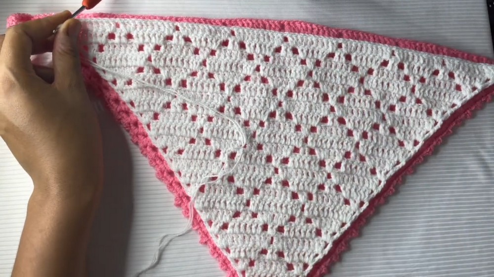 Each row builds upon the previous one, gradually forming the distinctive diamond pattern by combining increases and decreases in just the right places. The early rows are focused on establishing a firm and even rhythm, which ensures the balance and symmetry of the bandana.