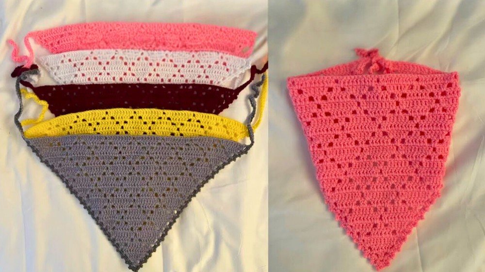 To finish, a soft lace border is added around the edges, achieved by working single crochet stitches in a smooth and consistent manner. At the same time, functional straps are attached by chaining a desired length of stitches and then reinforcing them with a durable row of single crochets. The result is a bandana that’s not only visually stunning but also designed for long-lasting wear.