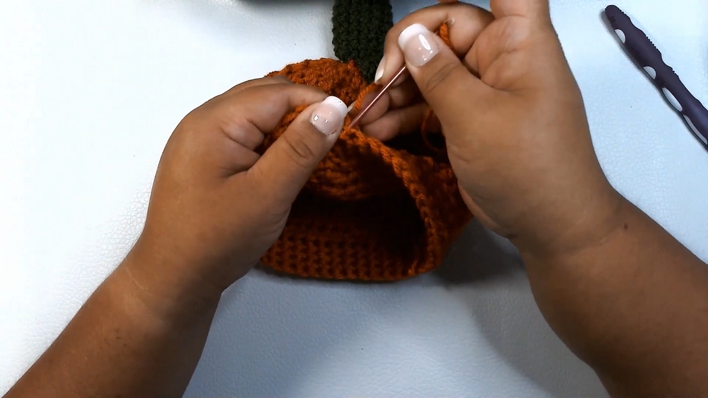 When working the pumpkin ribs (Rounds 4–7), remember to work into back loops only consistently. This technique creates the texture that replicates a pumpkin’s natural ridges and gives the hat its signature look.