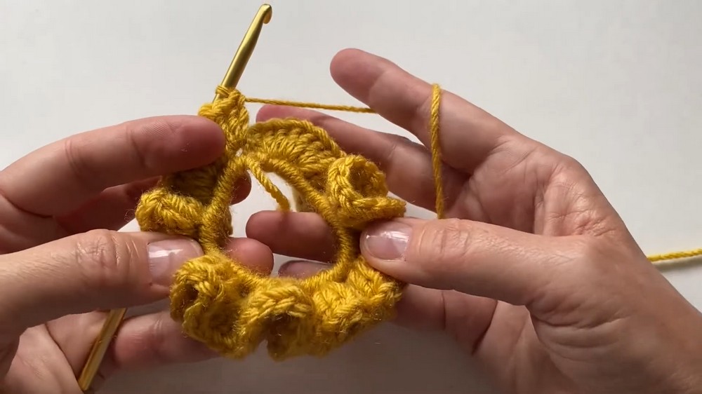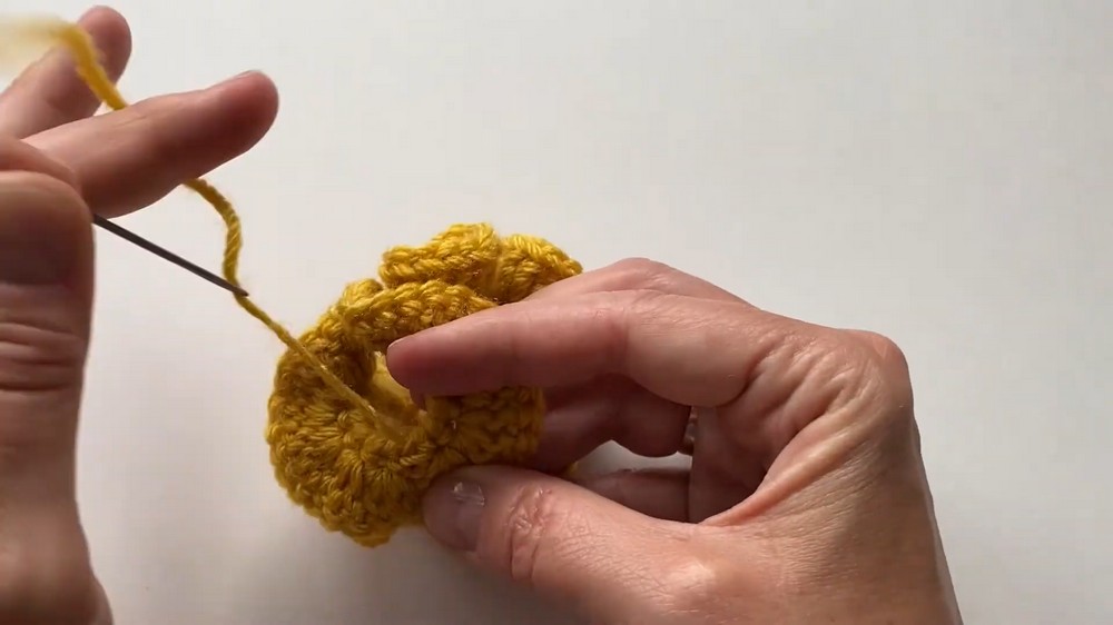 • Trim the yarn, pull it through the final loop, and weave the ends securely into the scrunchie with a weaving tool or by tying a knot.